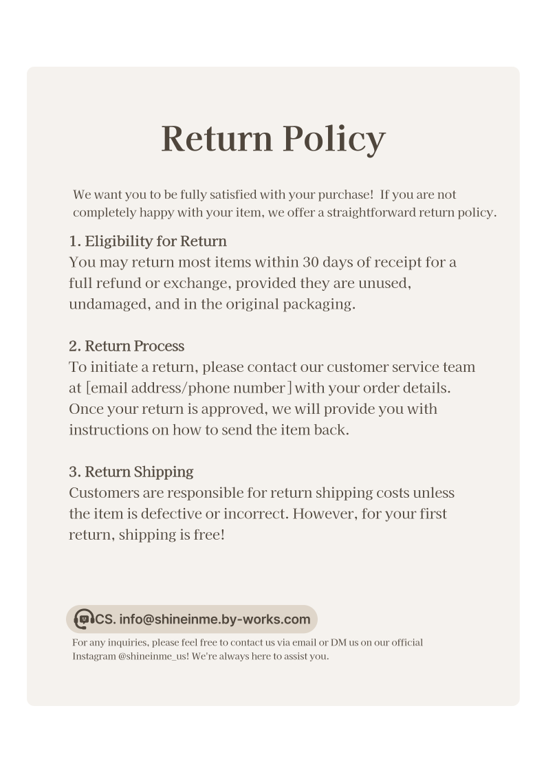 - Return Shipping: Customers are responsible for return shipping costs unless the item is defective or incorrect. However, for your first return, shipping is free!